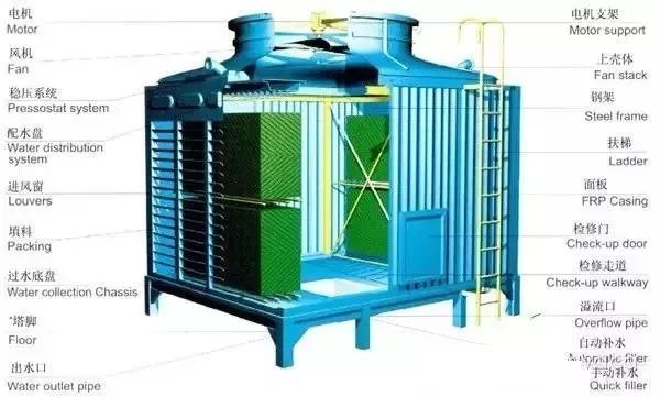 上述各種部件的不同組合,構(gòu)成各種形式和用途的冷卻塔:開放點(diǎn)滴式冷卻塔、風(fēng)筒式自然通風(fēng)冷卻塔、抽風(fēng)(或鼓風(fēng))逆流式冷卻塔、抽風(fēng)橫流式冷卻塔等。