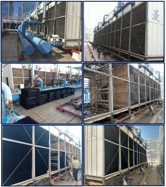 TCL總部大樓采購國內(nèi)知名品牌,冷卻塔總冷量為6000冷噸,原生產(chǎn)廠家已經(jīng)停止生產(chǎn)該款尺寸冷卻塔填料,管道多個部位均出現(xiàn)破裂漏水,我司排除專業(yè)技術(shù)團(tuán)隊,在不停機(jī)狀況下完成整個升級改造,效果于新設(shè)備無異。