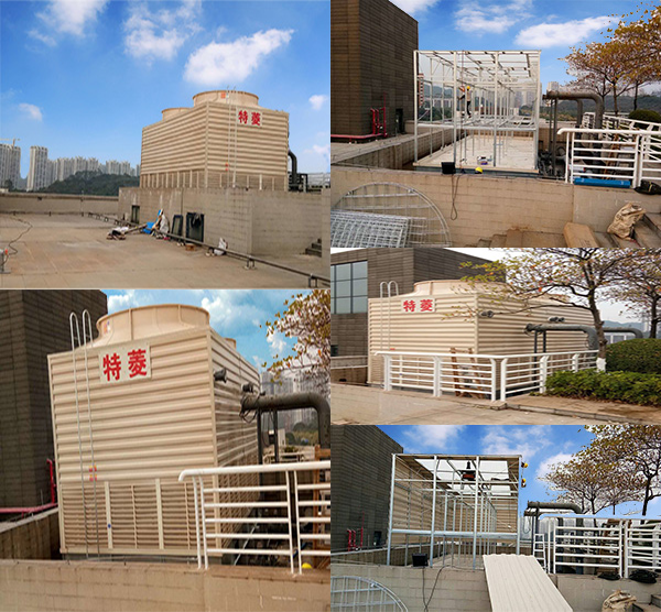 惠州東江環保橫流方形冷卻塔安裝 廣東特菱空調(http://www.wrmia.cn)方形橫流式玻璃鋼冷卻塔結構特點: (1)擋板:玻璃鋼材質,表面光滑美觀,耐腐蝕,防老化。 (2)填料:改性聚氯