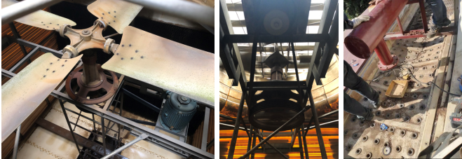 改造前為高轉速動力系統(tǒng),噪音大 出風口被擋住,散熱效率差 冷卻塔接水盤破裂